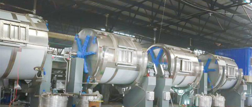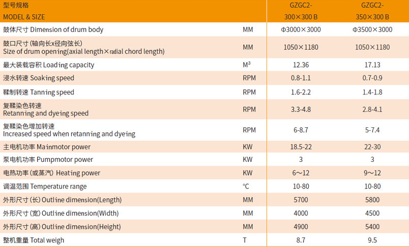 主要功能与特点 使用该转鼓可以减少浸水、鞣制、染色工序用水量,可以减少化工原料用量。鼓内采用新式结构,在同样工艺时间内使皮张 更柔软、染色更均匀。比普通转鼓多装载30%以上,装载总量可以达到转鼓容积的60%—70%。 1、转鼓鼓体采用不锈钢板材制作,鼓体内外层之间用优质保温材料填充。转鼓另一端装有含多种功能的交换器系统,鼓内有单方向旋转自动液体循环系统。为方便操作,在机器右侧装有辅助控制电器箱。 2、转鼓一侧配置重锤排气阀,从而确保鼓体在工作过程中始终鼓内无压力。 3、鼓体内装有带倾斜度的长档板,这种挡板机械作用大,特别适合牛皮加工 4、为缩短转鼓清洗时间,在鼓体一侧增加了两组手动排水装置。 5、传动系统:电动机经转鼓专用减速箱变速后,再通过齿轮带动鼓体转动。减速箱的主动轴上配置了气动刹车装置。 6、电气控制系统:采用变频调速、PLC电路控制。 主要技术参数